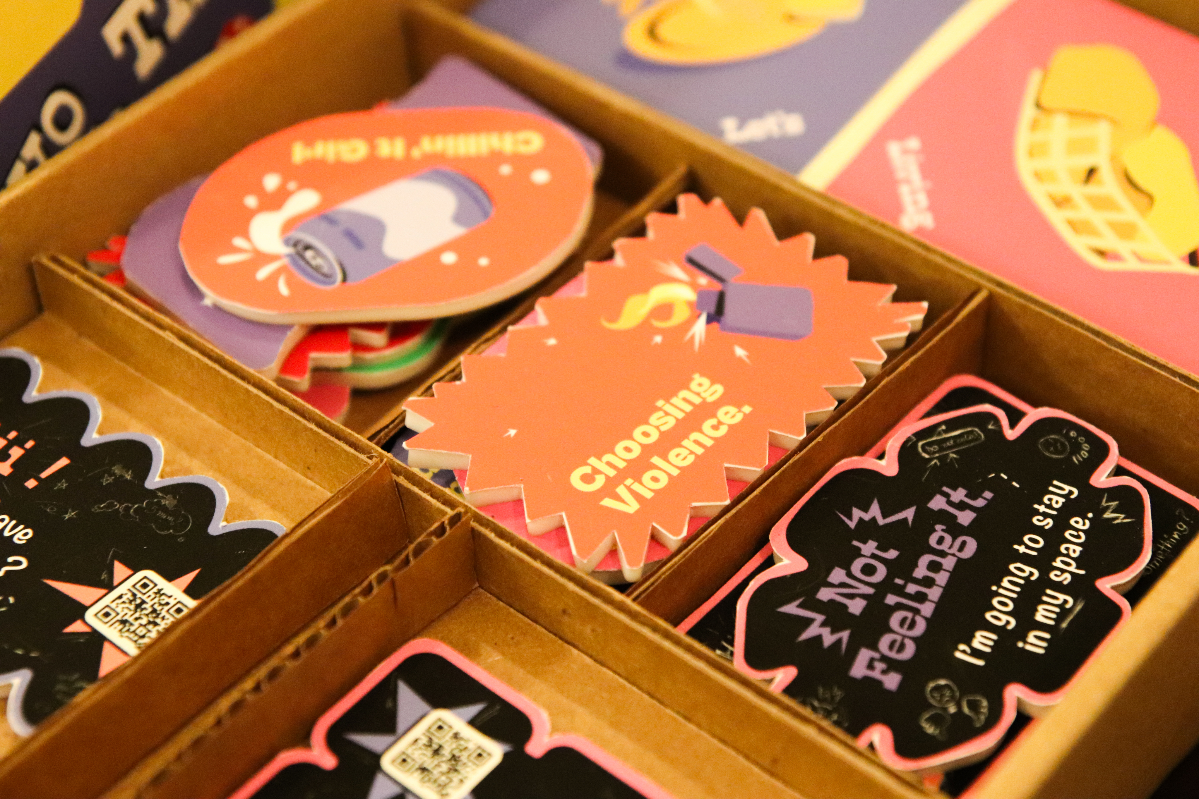 A magnet with a QR code linking to a web app that helps start difficult conversations.