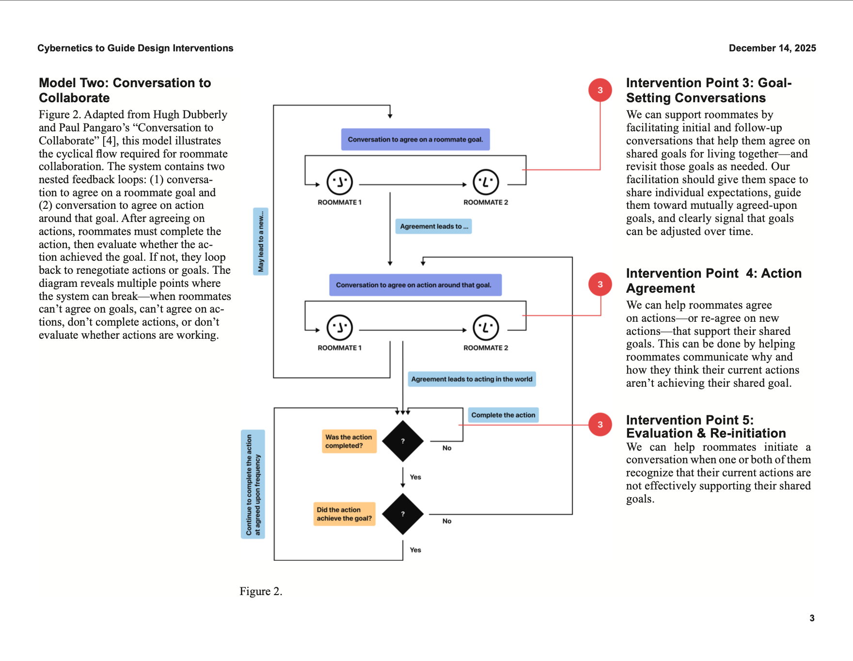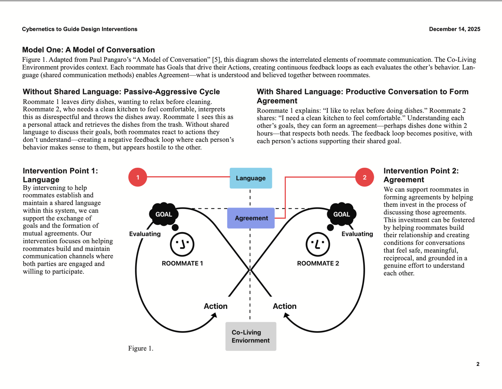 I adapted two cybernetics models by Paul Pangaro, identifying research-backed intervention points. My paper, Using Cybernetic Methods to Guide Designer Interventions in Roommate Communication for Conflict Navigation, is available here.