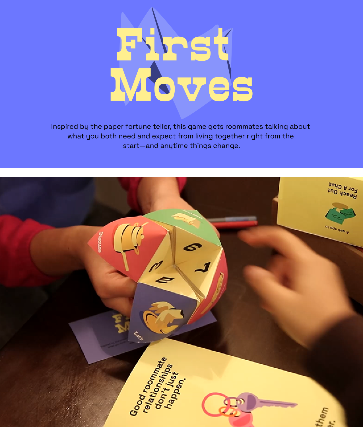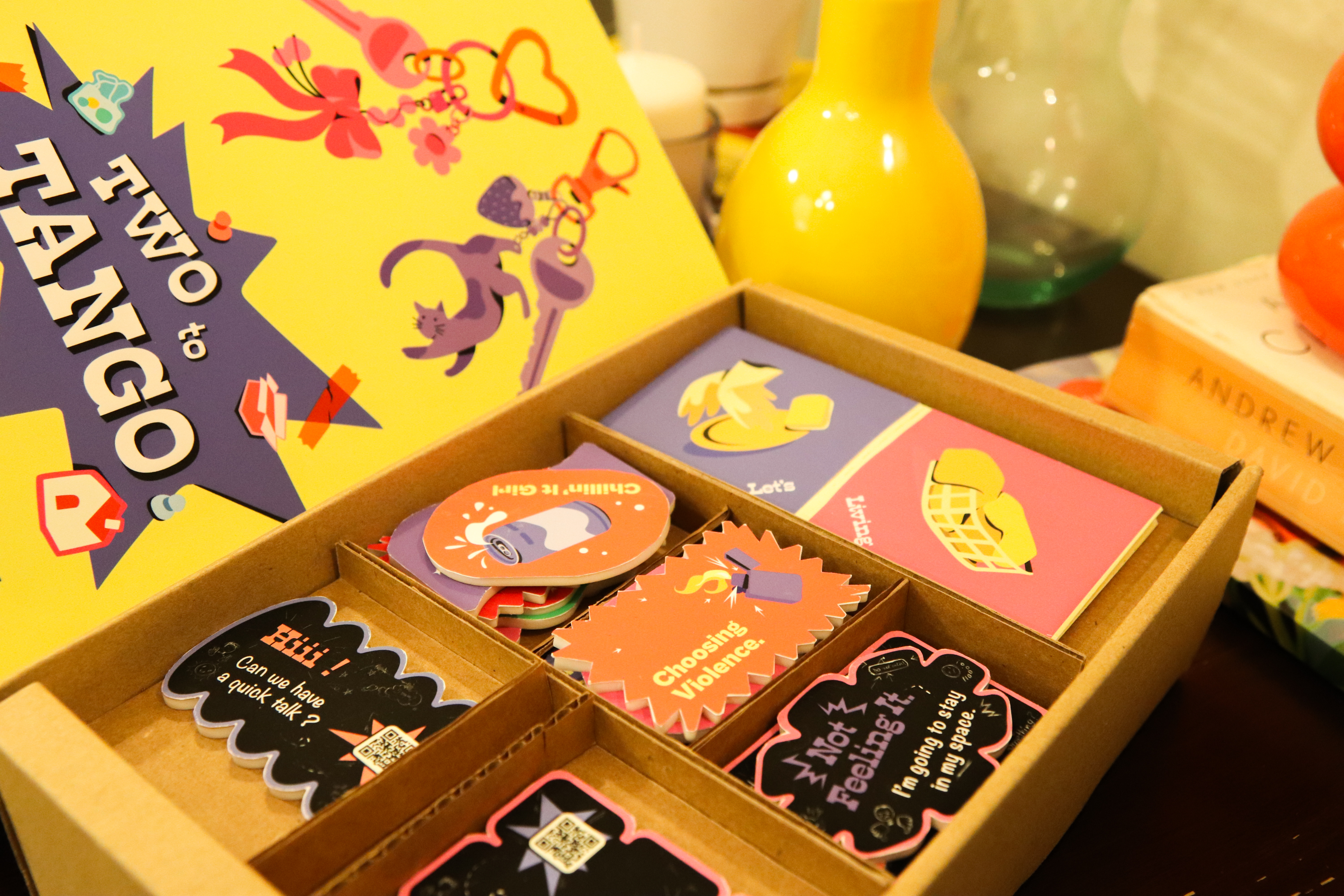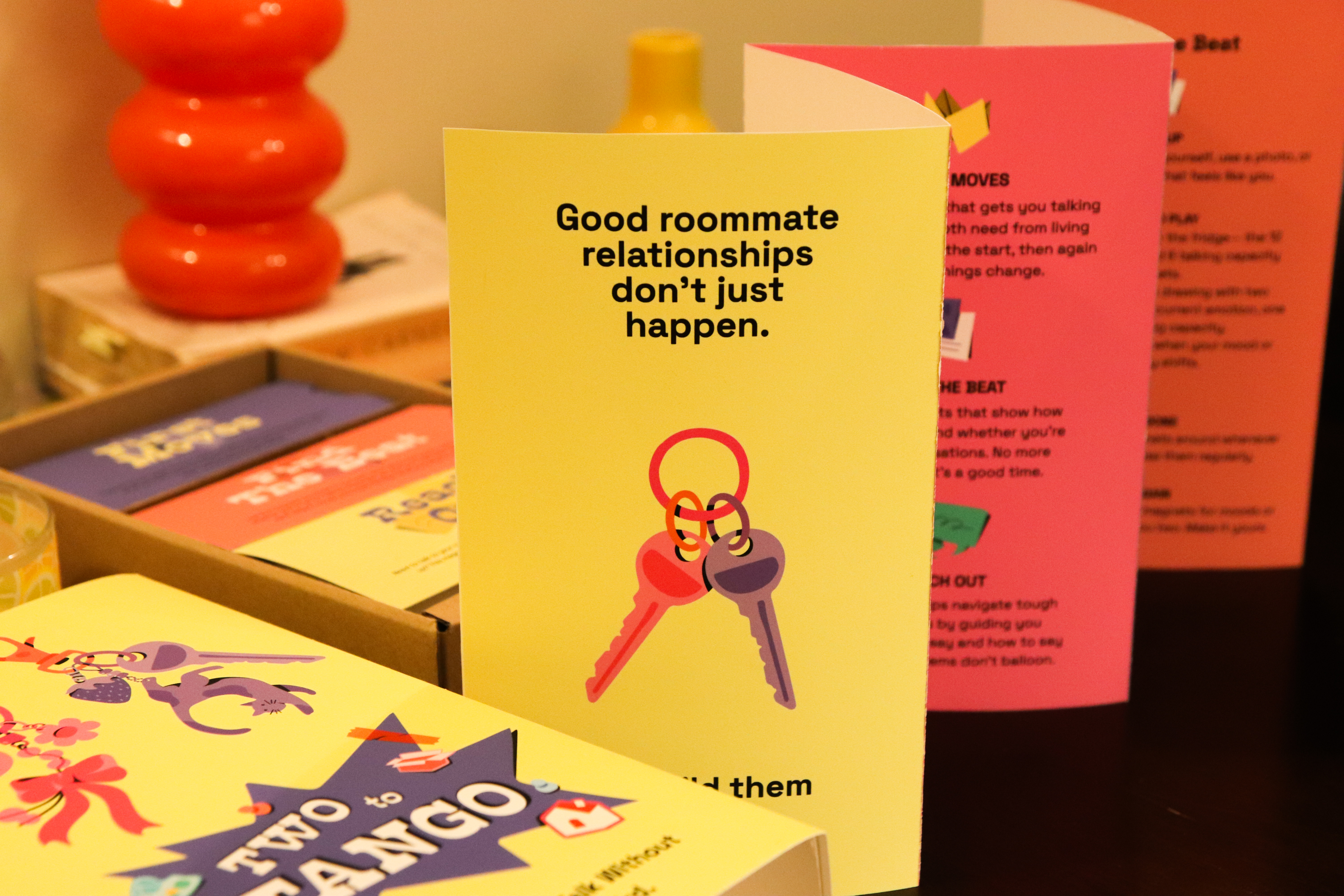 We designed TwoToTango, a three-part physical toolkit that lowers barriers to difficult conversations. The toolkit works throughout the roommate lifecycle, from move-in to daily living to conflict moments, providing structured, low-stakes ways to establish communication methods, build relationships, and address issues before they escalate.