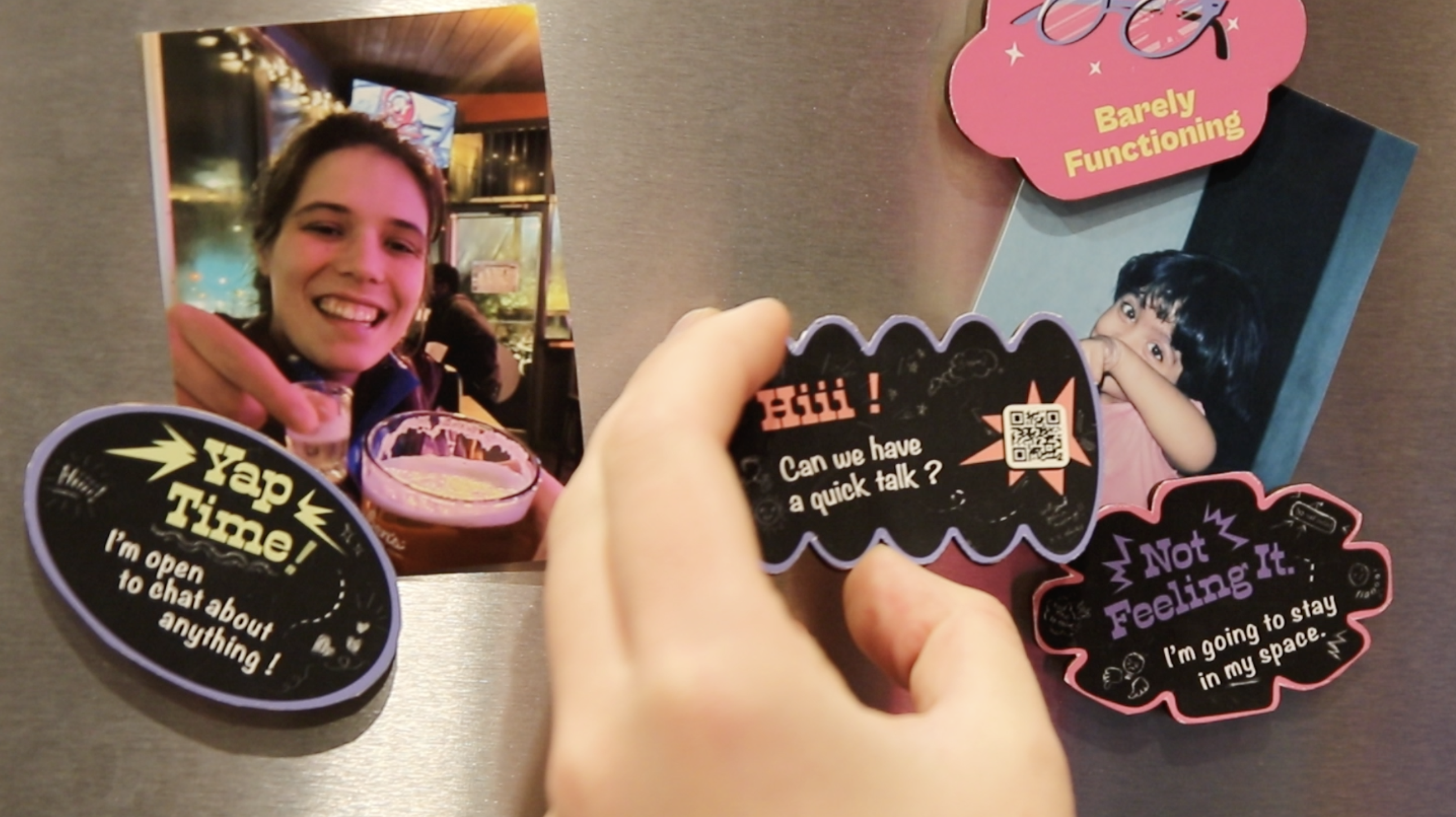 The magnet signals when someone wants to talk, and the QR code in the shared space links to a web app where users can send conversation cards to their roommate.